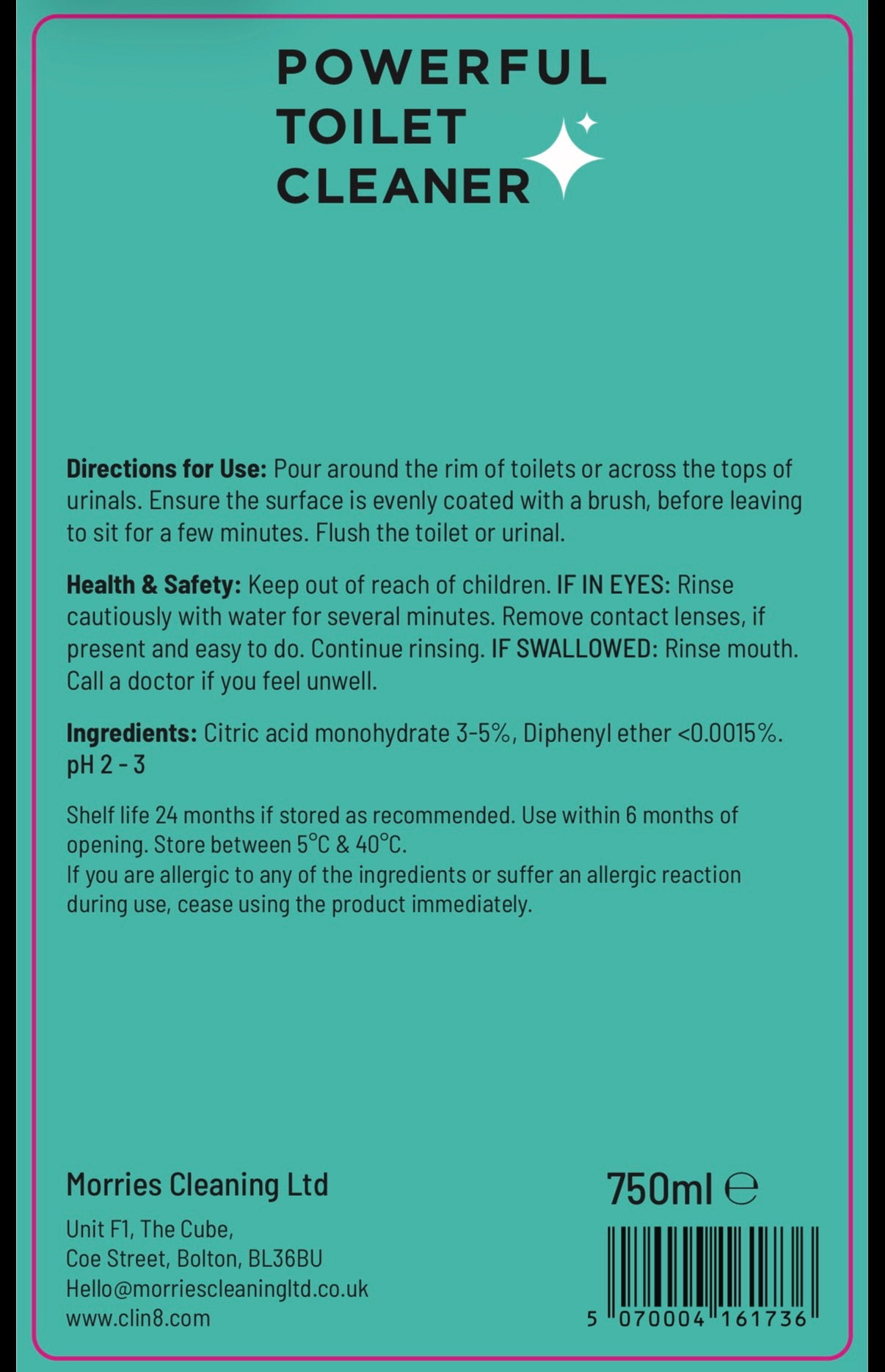 Clin8 Toilet Cleaner combines powerful descaling action with natural deodorizing properties to maintain pristine sanitary facilities. Infused with a refreshing citrus fragrance, it cuts through stubborn limescale and mineral deposits whilst neutralizing odours, leaving toilets and urinals hygienically clean and pleasantly scented. Ideal for both residential and commercial applications where performance and freshness matter.